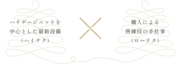 OEM製造により国内外の一流メゾンのニット製品を数多く手掛けています。中でも、編み目の細かいハイゲージニットの成型技術及び設備内容は国内トップクラスを誇ります。企画・デザイン・編立・加工・縫製・加工・検査まで自社で一貫生産し品質管理を徹底しています。